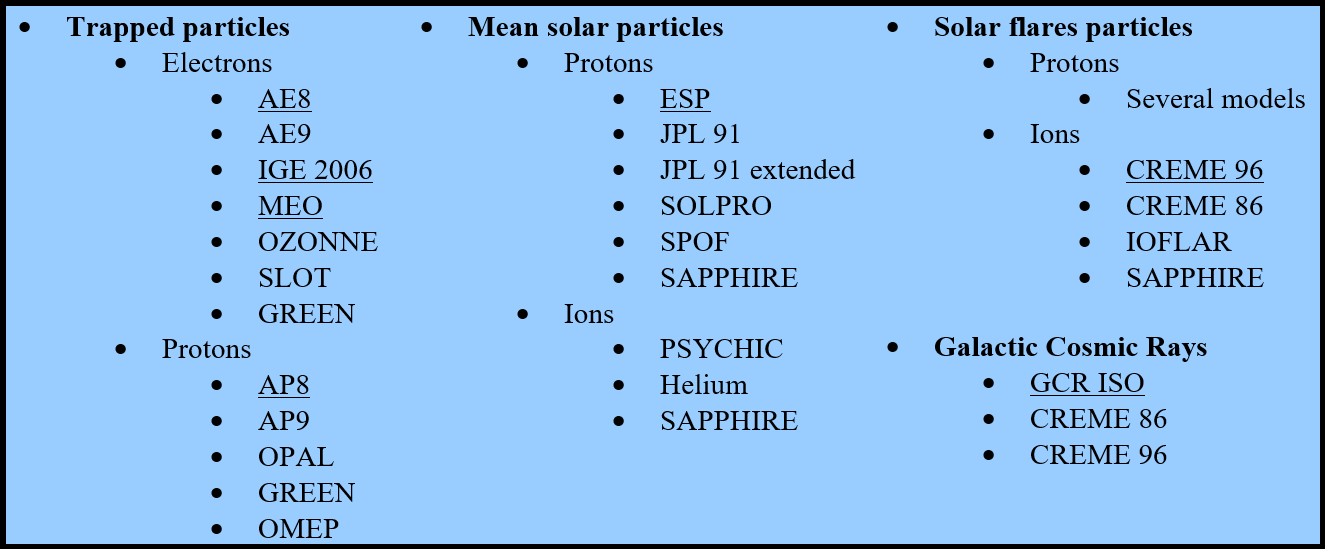 Numerous environment models can be used, including all the standard (ECSS-10-04) models: