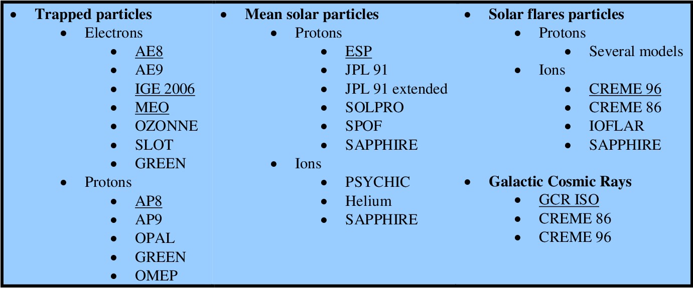 De nombreux modèles d’environnement sont disponibles, parmi lesquels tous les modèles du standard (ECSS-10-04C).